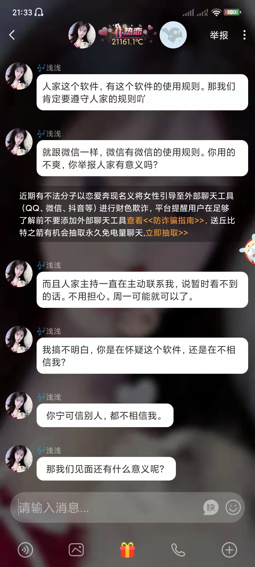 用户罗某投诉处电称:“一月十二号在处电交友app上认识一个女的,对方说是附近人所有聊上了,想加对方微信对方要求要表白然后去家族官宣要微信号,家族要求刷礼物,才能表现出对女嘉宾的真心,她和我说只要刷里两个礼服,但家族里要求越来越高我一直问女方他和我说,在刷一个但越来越多我已经没有钱了,女方还说和我一起承担费用。家族那边是女方和她联系的,叫我们等到后天就可以家对方微信但等了两天还是不能加对方微信,我感觉对方在拖延时间,后来我问后台客服说,没有任何刷礼物和亲密度可以获取对方联系方式,我就感觉被骗了。”。