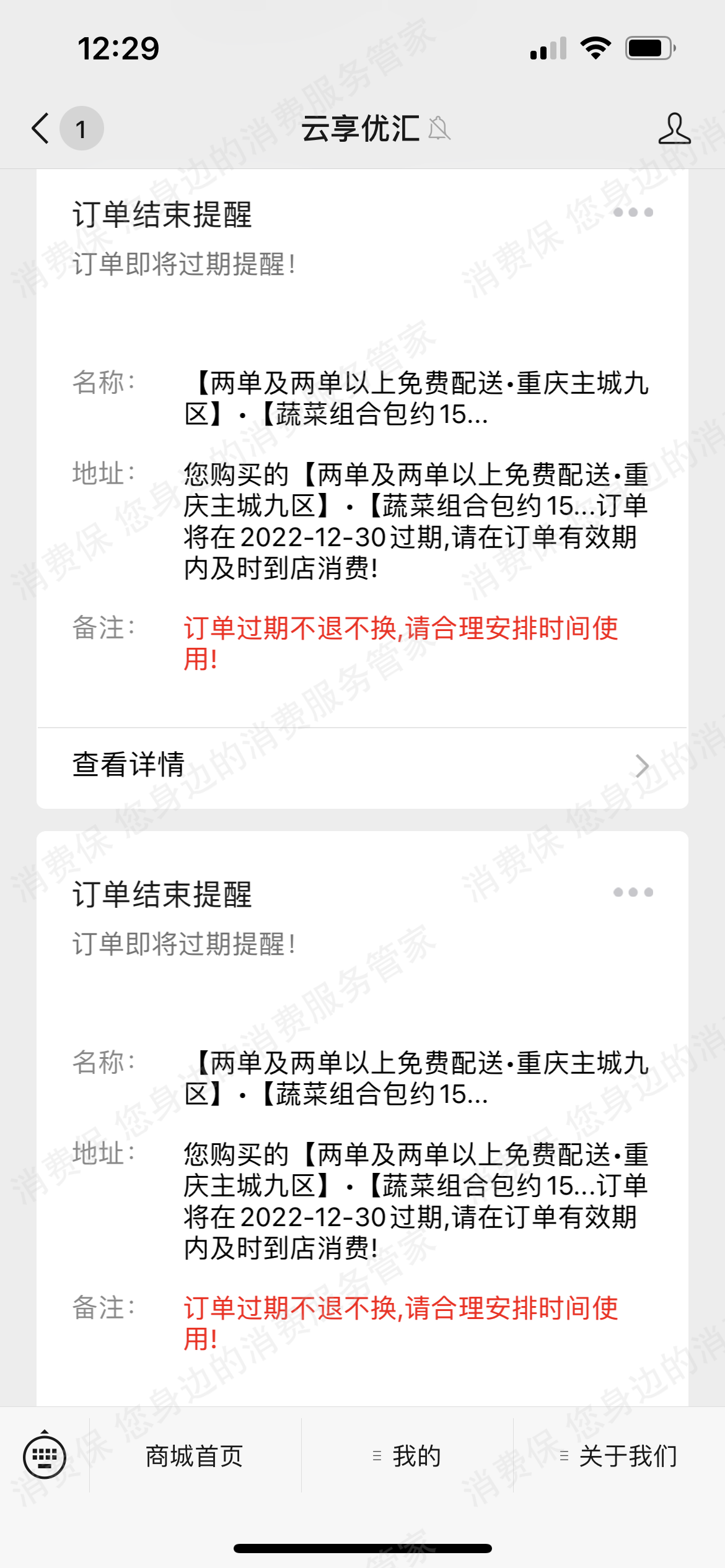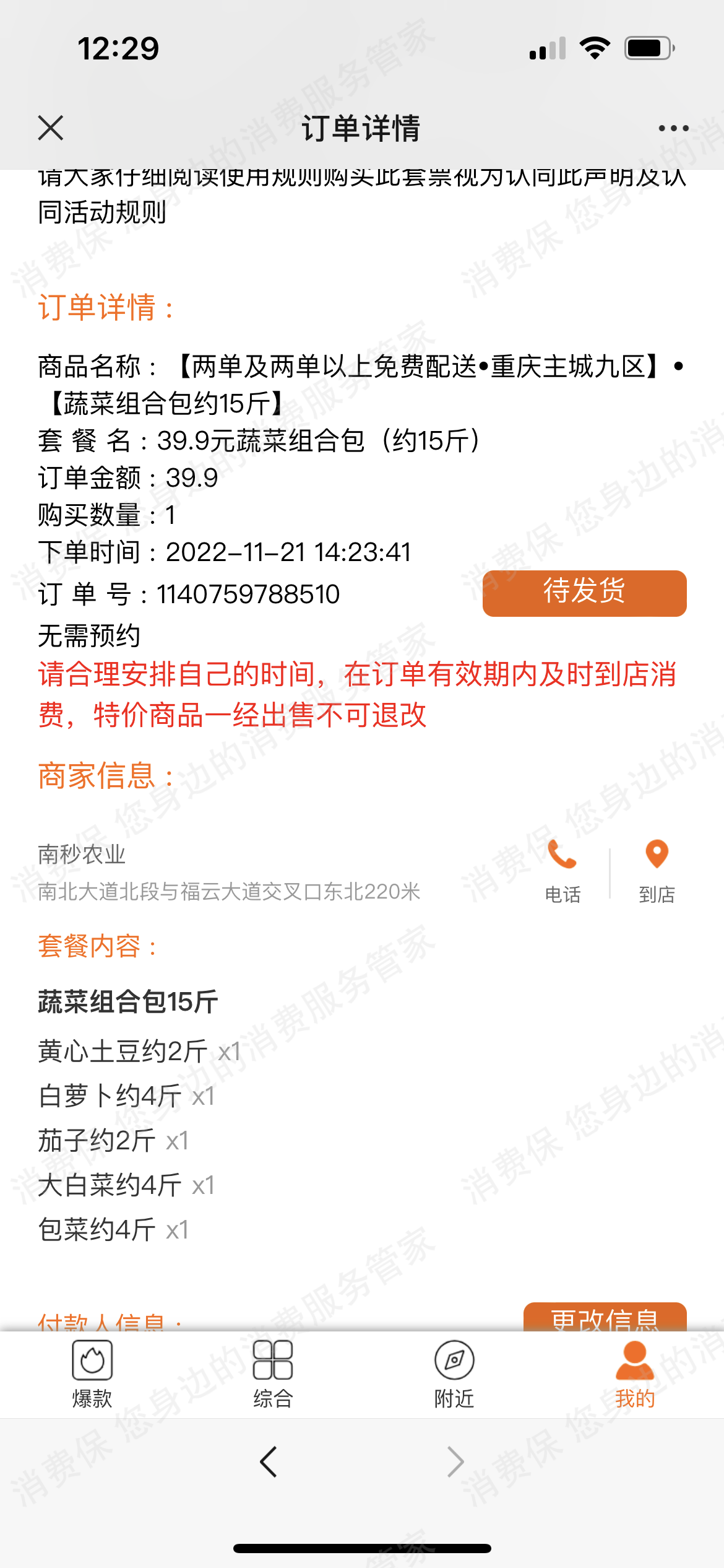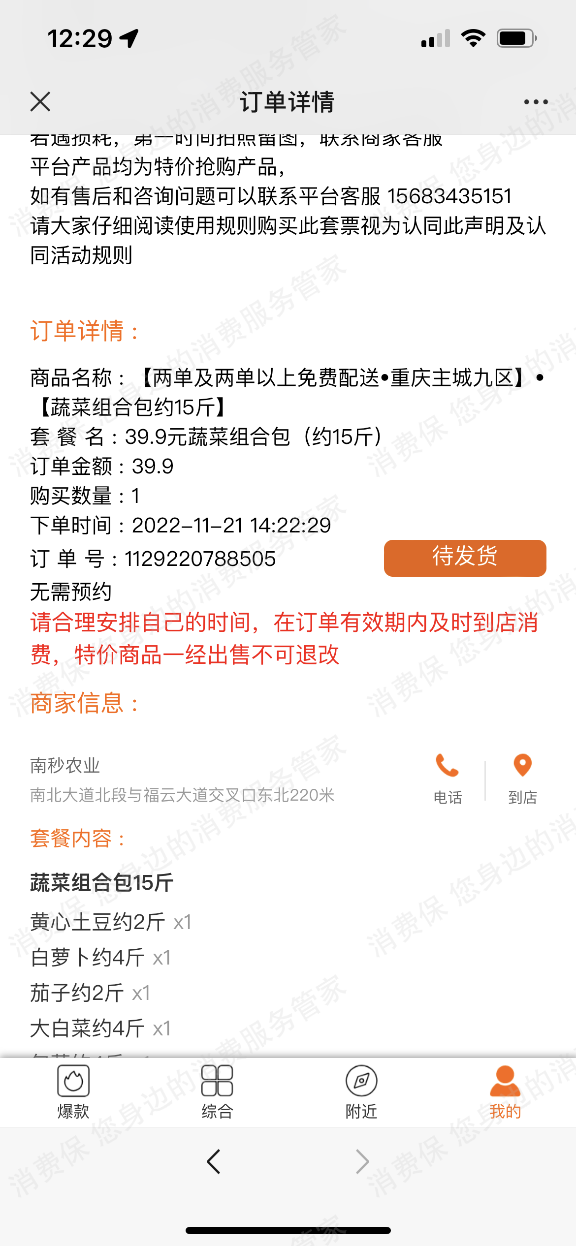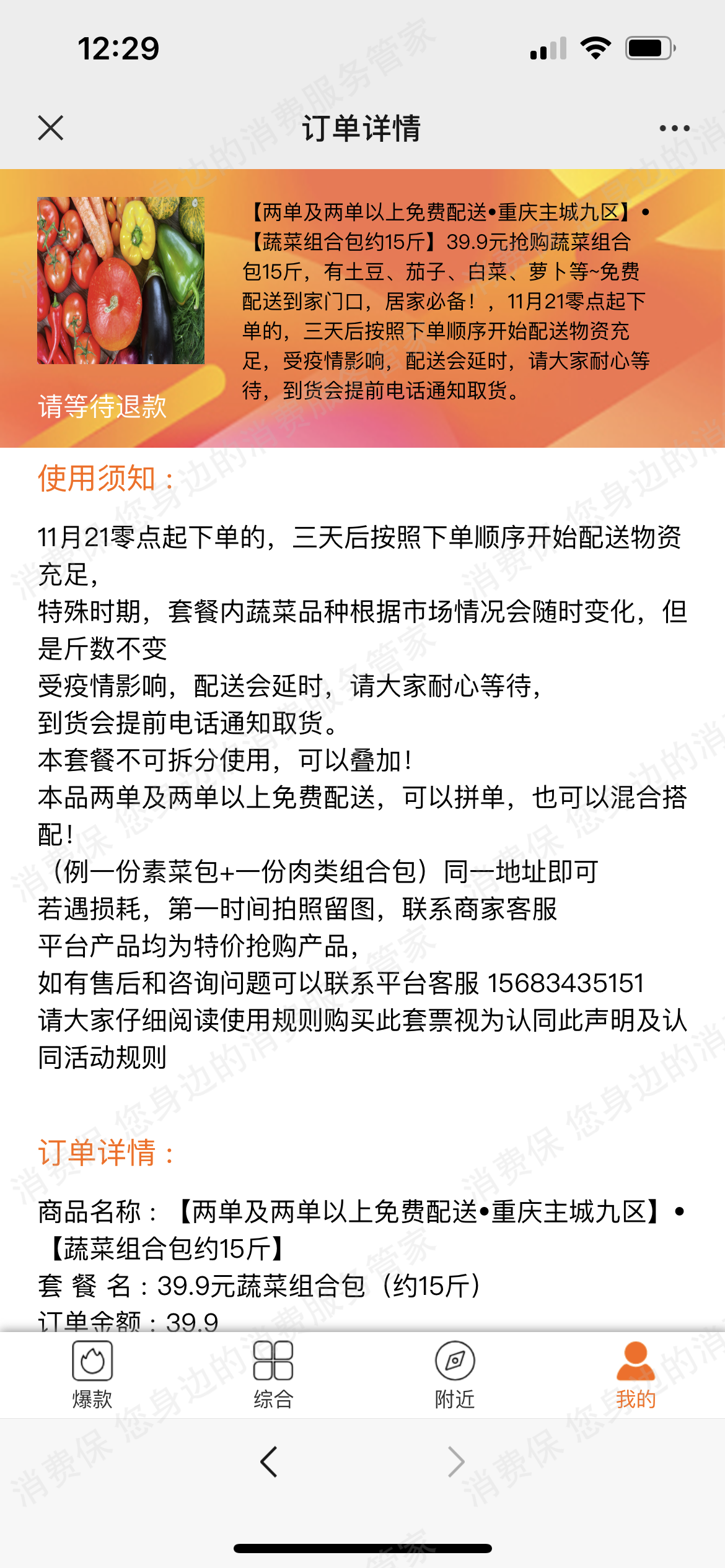 2022-12-24重庆的曾某向消费保投诉称”因11月疫情封控期间急需物资,在该小程序购买了两个单价为39.9的蔬菜包,平台上写的是购买三天后陆续发货,等你很长段时间,一直未发货,直到解封之后也未发货,我就申请退款,平台上面写退款需要等一周的时间自动退款,一周的时候也过了,一直未收到退款,该平台现在只显示请等待退款,商家电话以及客服电话根本联系不上,12月23日下午两点我根据平台加上了客服微信,就把情况告诉了客服,客服也是一直发朋友圈都不回复我,直到晚上十点多回复我说蔬菜包已经配送了,这期间我从未收到也没有接到他们的电话通知我取货 ,12月24日早上该小程序直接提醒我的两个订单即将过期结束,然后还写订单过期不退不换“
