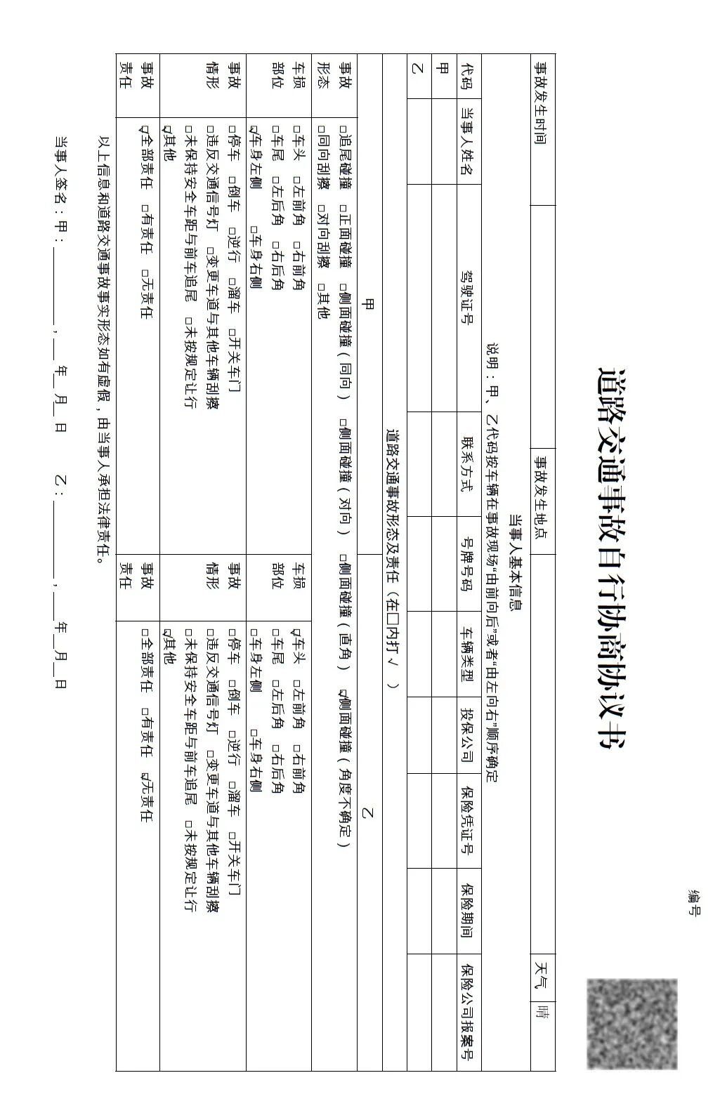 《道路交通事故处理程序规定》21条规定:“当事人自行协商达成协议的,制作道路交通事故自行协商协议书,并共同签名。道路交通事故自行协商协议书应当载明事故发生的时间、地点、天气、当事人姓名、驾驶证号或者身份证号、联系方式、机动车种类和号牌号码、保险公司、保险凭证号、事故形态、碰撞部位、当事人的责任等内容。”