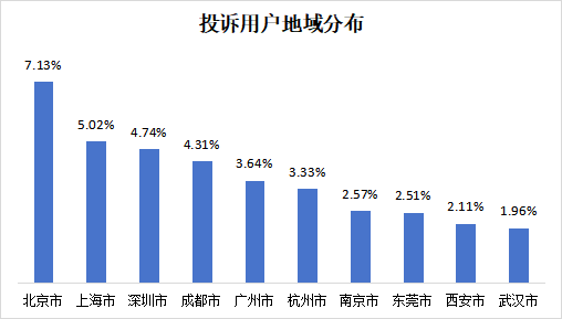 从地域分布来看,北京市以7.13%的投诉占比位居首位;上海市和深圳市分别排名第二、第三,占比为5.02%、4.74%。