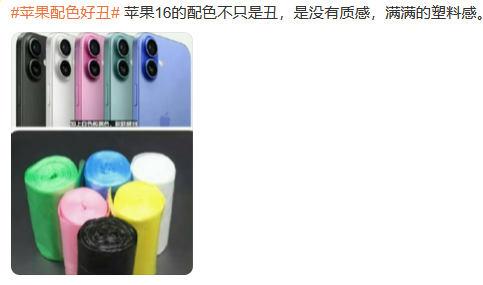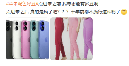 然而,网友似乎对这一届新机的变化并不买账,被吐槽最多的就是iPhone 16的配色了。有人觉得配色太土,粉色早已过时,像极了秋衣秋裤。