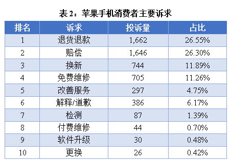 苹果手机消费者的投诉要求主要包含退货退款、赔偿、换新、免费维修、改善服务等;其中,要求退货退款的投诉高达1,662件,占比26.55%;要求赔偿的次之,共接到相关投诉1,646件,占比26.30%。