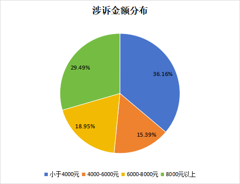 根据涉诉金额分布情况可知,金额在4000元以内的投诉占比最高,为36.16%;其次是金额在8000元以上的投诉,占比为29.49%。