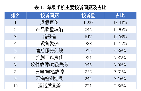 苹果手机主要投诉问题集中在虚假宣传、产品质量缺陷、信号差、设备发热、售后服务欠缺等方面。其中,虚假宣传以13.31%的占比位列榜首,产品质量缺陷次之,占比为10.97%。