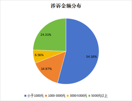 根据涉诉金额分布情况可知,金额在1000元以内的投诉占比最高,为54.16%;其次是金额在5000元以上的投诉,占比为24.31%。