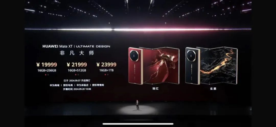 2024年9月10日,华为见非凡品牌盛典上,华为三折叠屏手机Mate XT非凡大师正式发布,售价19999元起,共有16G+256G、16G+512G和16G+1T三个版本,配色包括瑞红和玄黑,将于9月20日10:08正式开售。