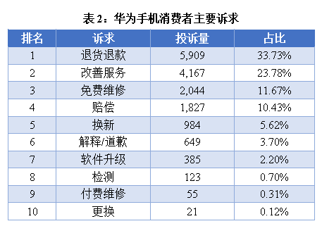 华为手机消费者的投诉要求主要包含退货退款、改善服务、免费维修、赔偿、换新等;其中,要求退货退款的投诉高达5,909件,占比33.73%;要求改善服务的次之,共接到相关投诉4,167件,占比23.78%。