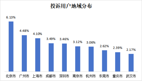 从地域分布来看,北京市以6.13%的投诉占比位居首位;广州市和上海市分别排名第二、第三,占比为4.48%、4.10%。