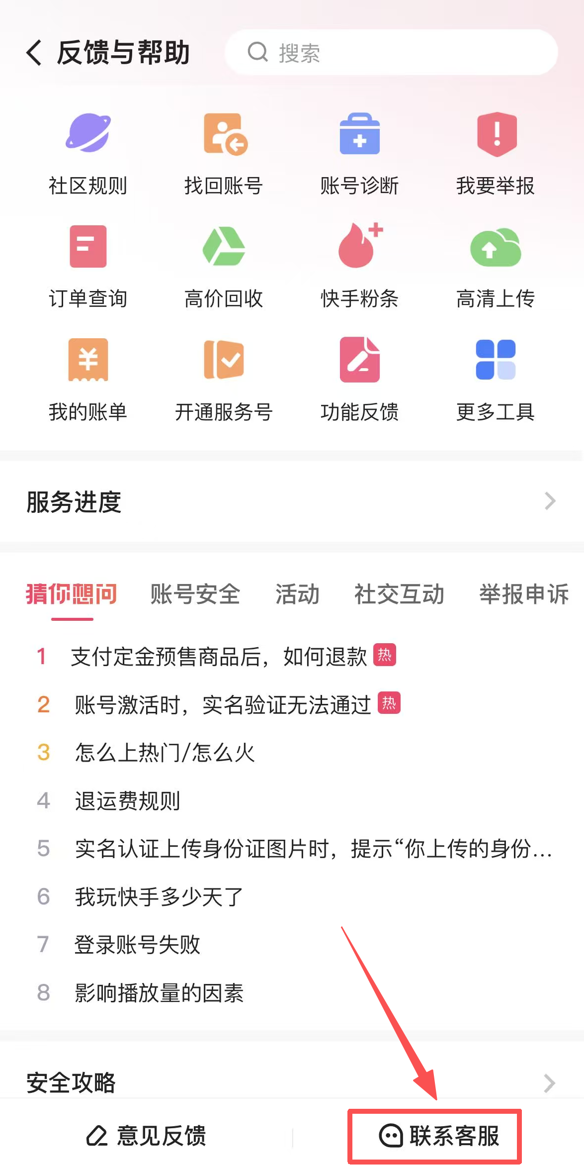 操作步骤:打开快手APP→点击底部导航栏"我"→右上角"≡"图标→选择"设置"→选择"反馈与帮助"→选择"联系客服"即可。