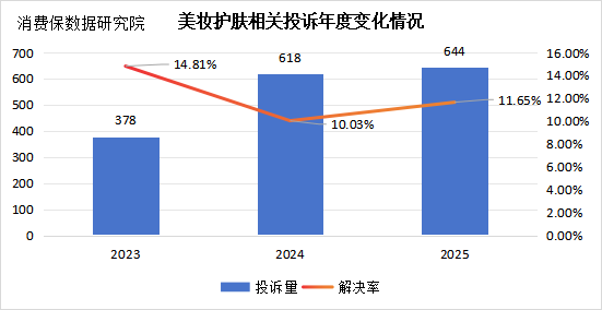 然而美妆护肤行业在其高速发展过程中也暴露出不少问题,据消费保维权平台最新发布的《美妆护肤投诉分析报告》显示,2025年1月至11月,消费保共收到美妆护肤相关投诉644件,涉及金额143.6万元,投诉解决率仅为11.65%,近两年投诉量出现较明显增长。