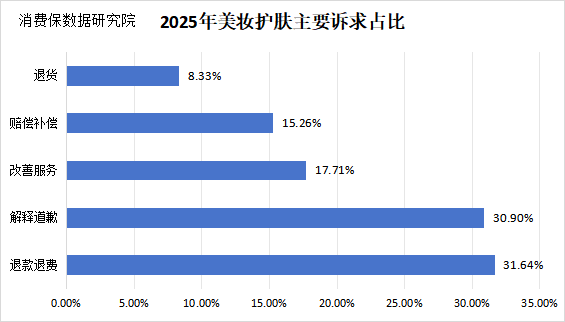 报告还显示,美妆护肤的投诉者诉求主要涉及退款退费、解释道歉和改善服务等;其中,要求退款退费的诉求占比达31.64%;其次是要求解释道歉,占比为30.90%;要求改善服务排名第三,占比为17.71%。