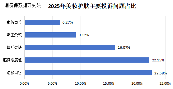 报告显示,美妆护肤的相关投诉主要集中在退款纠纷、服务态度差和售后欠缺等问题上,占比分别为22.58%、22.15%和16.07%。