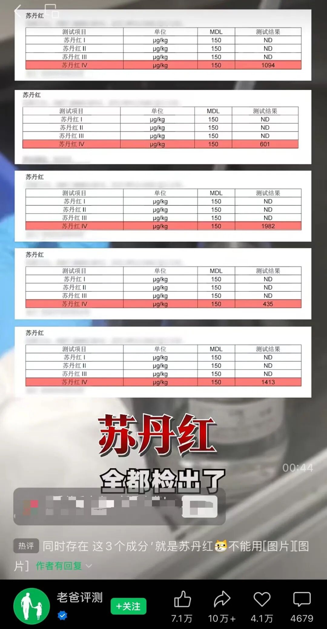 “老爸评测”在视频中指出,实验室在对一款护肤品进行检测时,筛查出了苏丹红成分;进一步调查发现,该违禁成分疑似来源于一款红色原料。该原料同时含有鳢肠提取物、印度楝叶提取物和辣木籽油,与涉事产品的成分表高度一致。