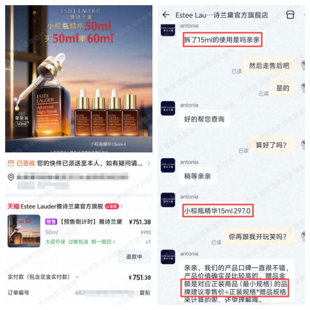 “我于2025年10月20号,在淘宝雅诗兰黛旗舰店购买护肤品精华50ml+4瓶15ml小样共计110ml,总共花费751元,试用一瓶小样后发生过敏现象。商品服务有过敏包退的服务保障,然而商家和淘宝均不支持。”章女士考虑自己试用了赠品,不需要商家全额退款,按比例扣除15ml的货款即可。