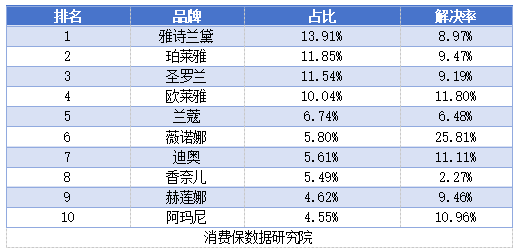 从近三年品牌的用户投诉占比来看,雅诗兰黛用户投诉占比位居第一,为13.91%;珀莱雅和圣罗兰紧随其后,占比分别为11.85%和11.54%,投诉榜前三名品牌的投诉解决率均较低。