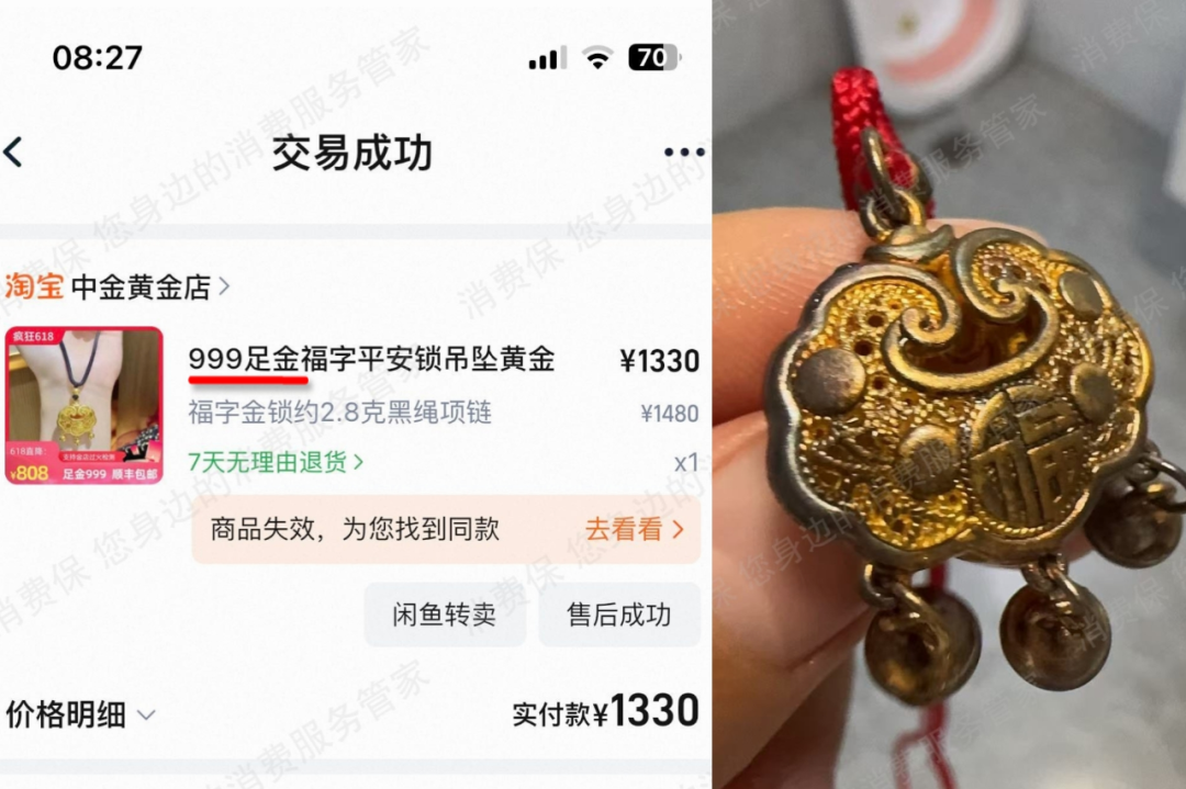 11月5日,黄女士在消费保投诉平台发布了关于淘宝商家售卖假黄金的投诉。图片上,所谓的“黄金吊坠”已明显掉色,暗沉发黑,显然不是黄金。而订单页面,商家赫然标注着“999足金”的字样。