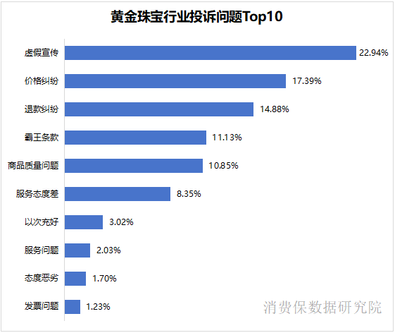 无论是线下门店购买还是网购,消费者都极容易掉进虚假宣传的陷阱。报告揭示,黄金珠宝行业投诉问题呈现高度集中化特征。其中,虚假宣传相关投诉占比达22.94%。不少消费者反映商家存在欺诈诱导行为,如将“K金”标注为“足金”,或以“免费换新”名义诱导消费,实际却收取高额工费。