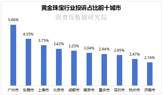 根据地域数据显示,黄金珠宝行业中,广州市的用户投诉量位居第一,占总投诉量的5.66%;东莞市(4.35%)位居第二,上海市(3.75%)位居第三。
