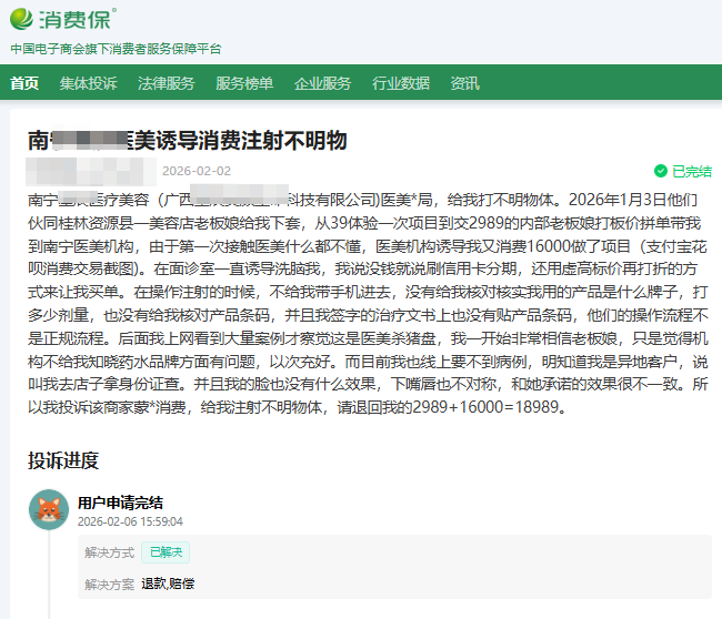 近年来,医美低价引流、诱导消费、注射不明产品的投诉屡见不鲜。近日,消费保接到来自广西李女士的医美投诉:李女士从39元体验项目被一步步诱导至消费近两万元,医美机构未核对产品信息、拒绝提供病历,术后还出现效果不符、面部不对称等问题。本期我们结合这起典型案例,揭秘医美套路,教你依法维权。退款不再难!