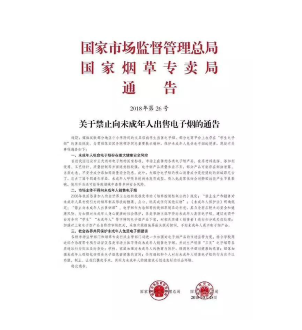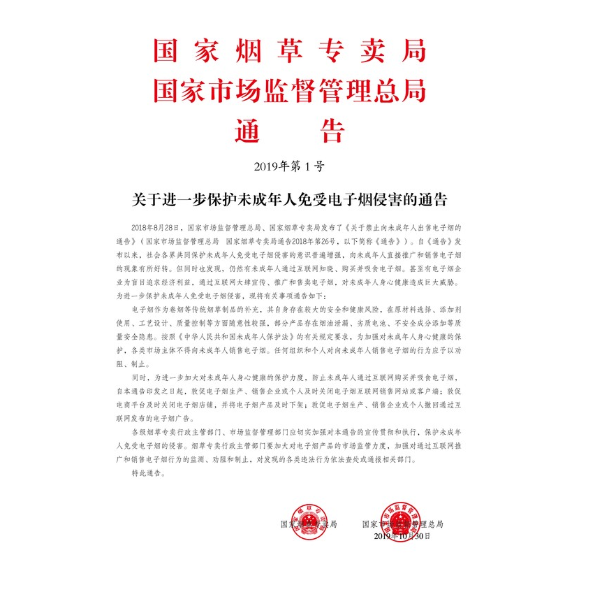 2019年11月,两部门再次联合发布了《关于进一步保护未成年人免受电子烟侵害的通告》,强调中国各类市场主体不得向未成年人出售电子烟,不得通过互联网出售电子烟。