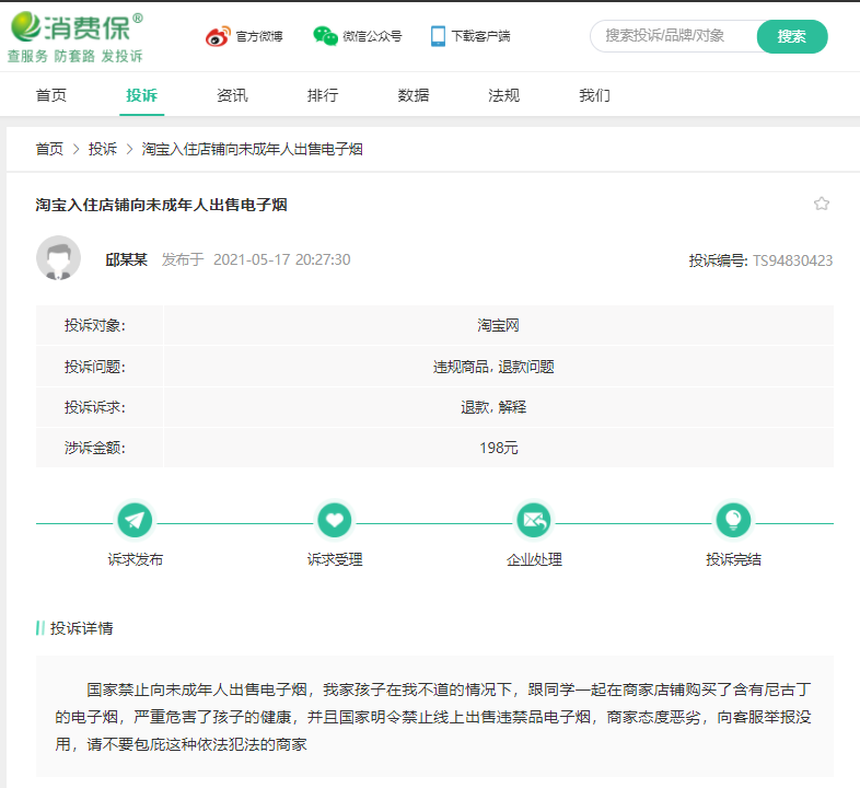 据这些家长们反映,近日发现淘宝有些商家违反《未成年人保护法》向未成年人出售电子烟,并且商家协商态度恶劣,淘宝举报商品无果,最后选择在消费保发起投诉。